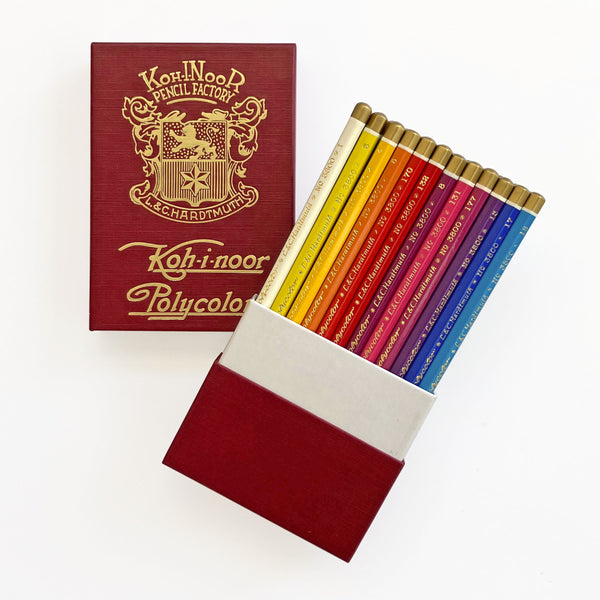 Paula's handpicked colored pencil set! Inside, you'll find twenty-four professional-grade colored pencils in a gorgeous range of bright and earthy tones. Each one features a smooth, water-resistant, non-toxic core wrapped in California Cedar, a renewable wood that prevents warping. The set comes inside a sturdy, retro-style case inspired by early 20th century design, complete with the founding family's coat of arms. The lid slides off, revealing the pencils standing in their case, along with a blurb card that tells the story of the family company that began in 1848 in Czech Republic. Did you know the Koh-I-Noor company invented graphite pencil lead? Many of their innovative products have won awards, and using these colored pencils, you'll understand why.