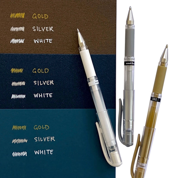Over the years, customers have asked about how to write on the dark colored paper of some of our cards. The Uniball Signo Gel Impact Pen has opaque ink that flows easily and dries quickly, making it the perfect pen for writing on darker paper. The secondary product image shows how the pens appear on the chocolate, navy and spruce papers that we use for our cards.