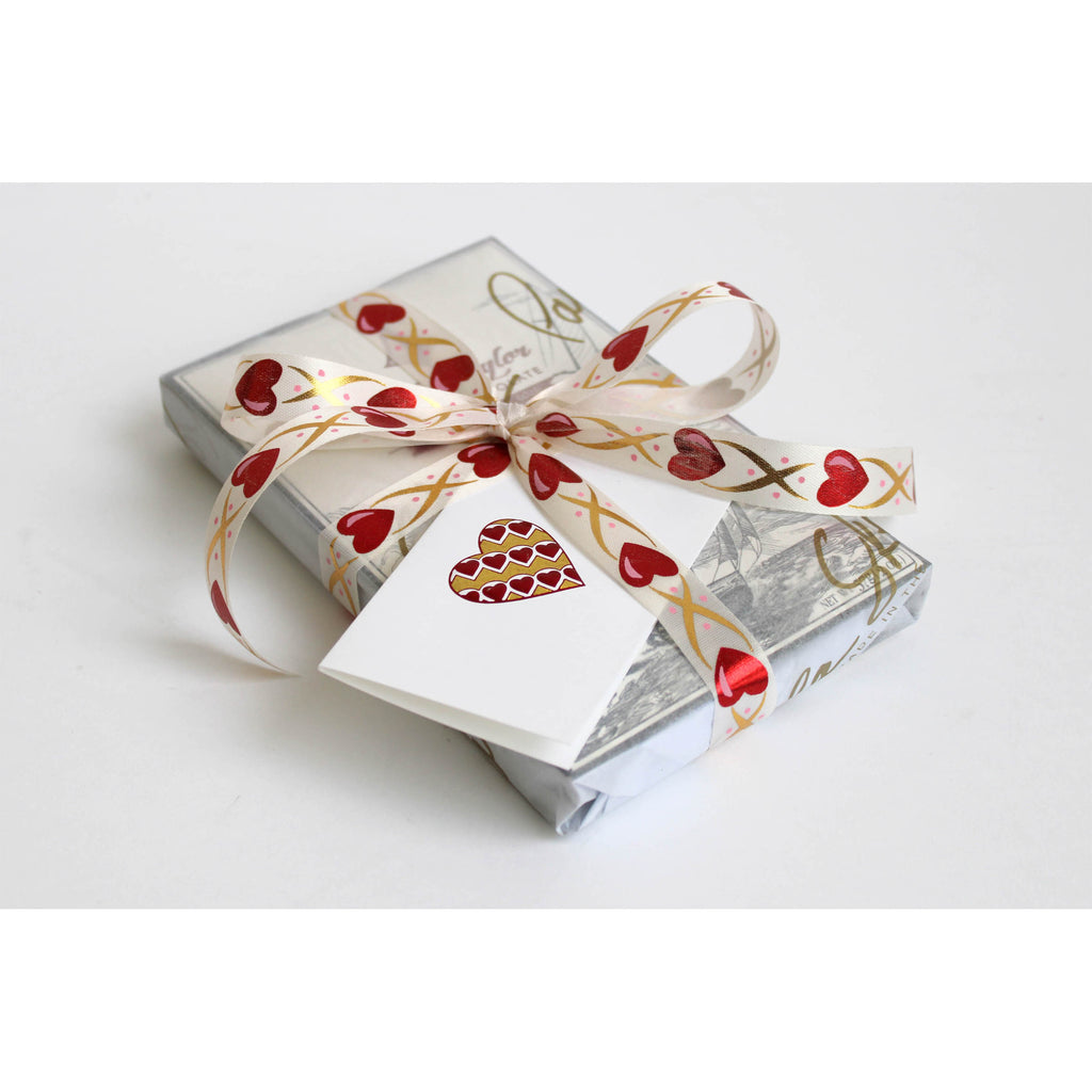 For Valentine's Day, give the gift of three Dick Taylor chocolate bars beautifully wrapped, tied with a heart patterned ribbon, and adorned with a Paula Skene Designs enclosure card.